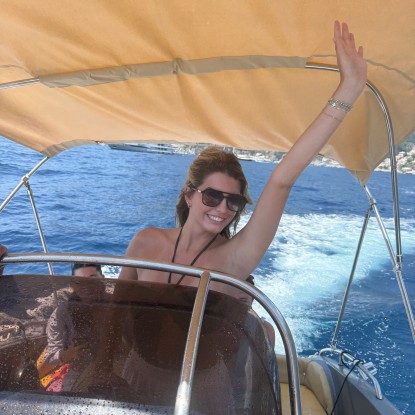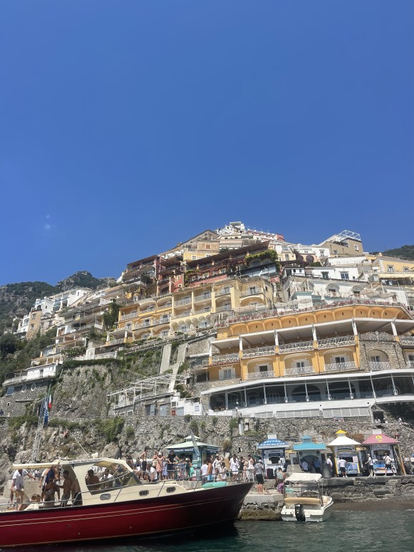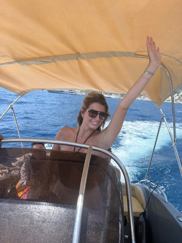 Saturday was hands down the best day of the trip, and honestly my favorite day abroad. We had booked a private six-person boat through Click and Boat to take us from Sorrento to Positano. Our captain picked us up at Il Porto di Marina Piccola, about 20 minutes from our Airbnb. Before heading to Positano, we stopped at a cave where we swam alongside hundreds of glowing blue fish. Once in Positano, we docked and had two hours to explore and shop.