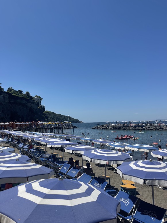 On Thursday after class, my friends and I took the train from Florence to Naples. The three-hour train ride flew by as we passed beautiful Tuscan landscapes and researched spots to visit on the coast. Once in Naples, we switched to the Circumvesuviana commuter train, which passes the Bay of Naples before arriving in Sorrento. We stayed in an Airbnb just a five minute walk from town and about a 15 minute walk from the beach. After checking in and unpacking, we headed to dinner at Capri Blu, where we had some of the best pizza of our entire time in Italy. Afterward, we explored and strolled through the lively streets of Sorrento before calling it an early night after a long day of travel.