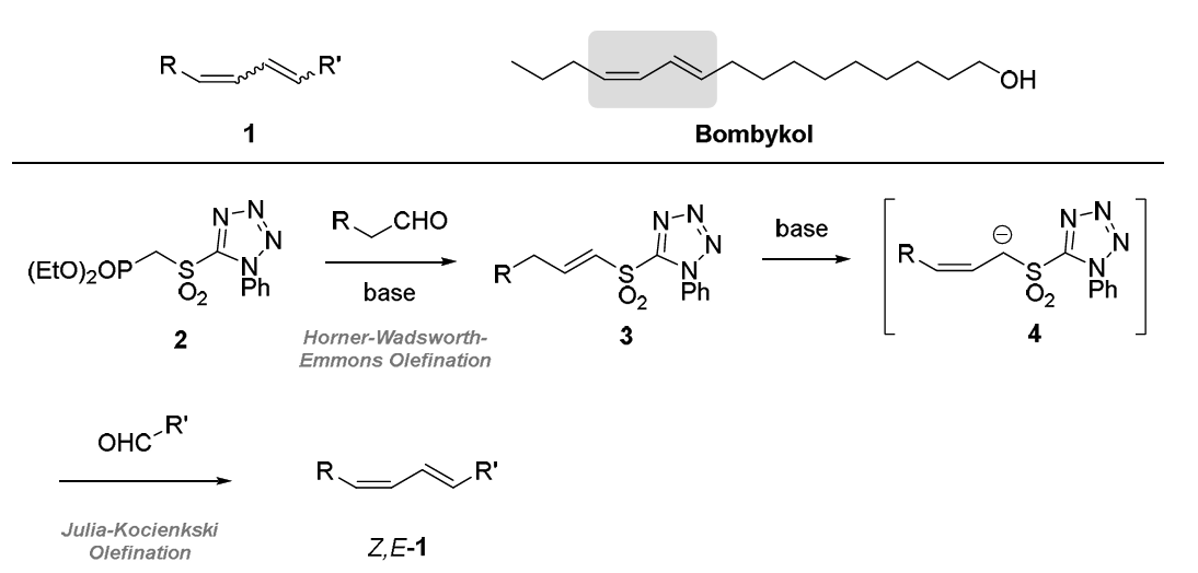 Figure 1. Conjugated 1,3-dienes and their proposed synthesis via a new HWE-JK cascade sequence.