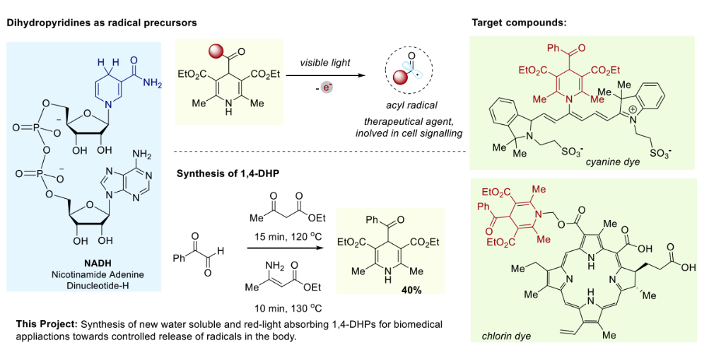 Inspired by nature, we propose using NADH analogues—1,4-dihydropyridines (1,4-DHPs)—as radical precursors for PDT. These molecules can be easily synthesized in a single step and release alkyl and acyl radicals upon irradiation. To adapt them for PDT, they must be water-soluble and absorb red light. This project aims to prepare hybrid 1,4-DHP molecules that meet these crucial criteria. The student will be involved in the design and synthesis of new 1,4-DHP hybrids. The products will be characterized using NMR and UV-Vis spectroscopy, and their radical-releasing properties will be tested using a reaction with a radical trap.